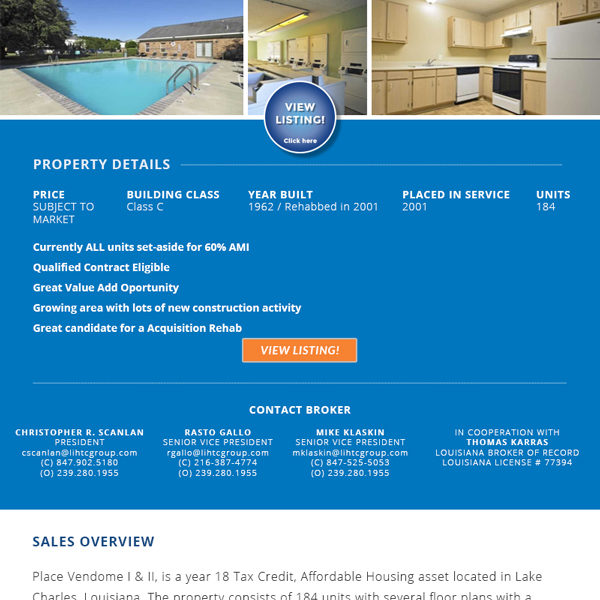 The LIHTC Group Branding & Marketing Support for National Brokerage Firm The LIHTC Group is a brokerage & consulting firm supplying affordable housing assets to investors nationwide. With offices in Chicago, Florida, and California, the LIHTC Group brokers have completed nearly $3 Billion in apartment building transactions across all 50 states and Puerto Rico. They have extensive experience helping buyers and sellers execute complex transactions involving state housing agencies and the procedures required for sale. Clicks Web Design worked with The LIHTC Group to design their website and handles on-going updates to their listing sheets for their Constant Contacts email marketing campaign. Marketing template to attract new sales: The LIHTC Group favors Constant Contact for alerting customers of new property listings. For several years, Clicks Web Design has managed design revisions for each new property listing. But when it came time to refresh the template design, Clicks Web Design collaborated with the LIHTC Group on a more modern, high-end layout intent on capturing the attention of their target audience. Before/After Redesign: Image Preview This project involved: Graphic DesignWordPress Visit Website